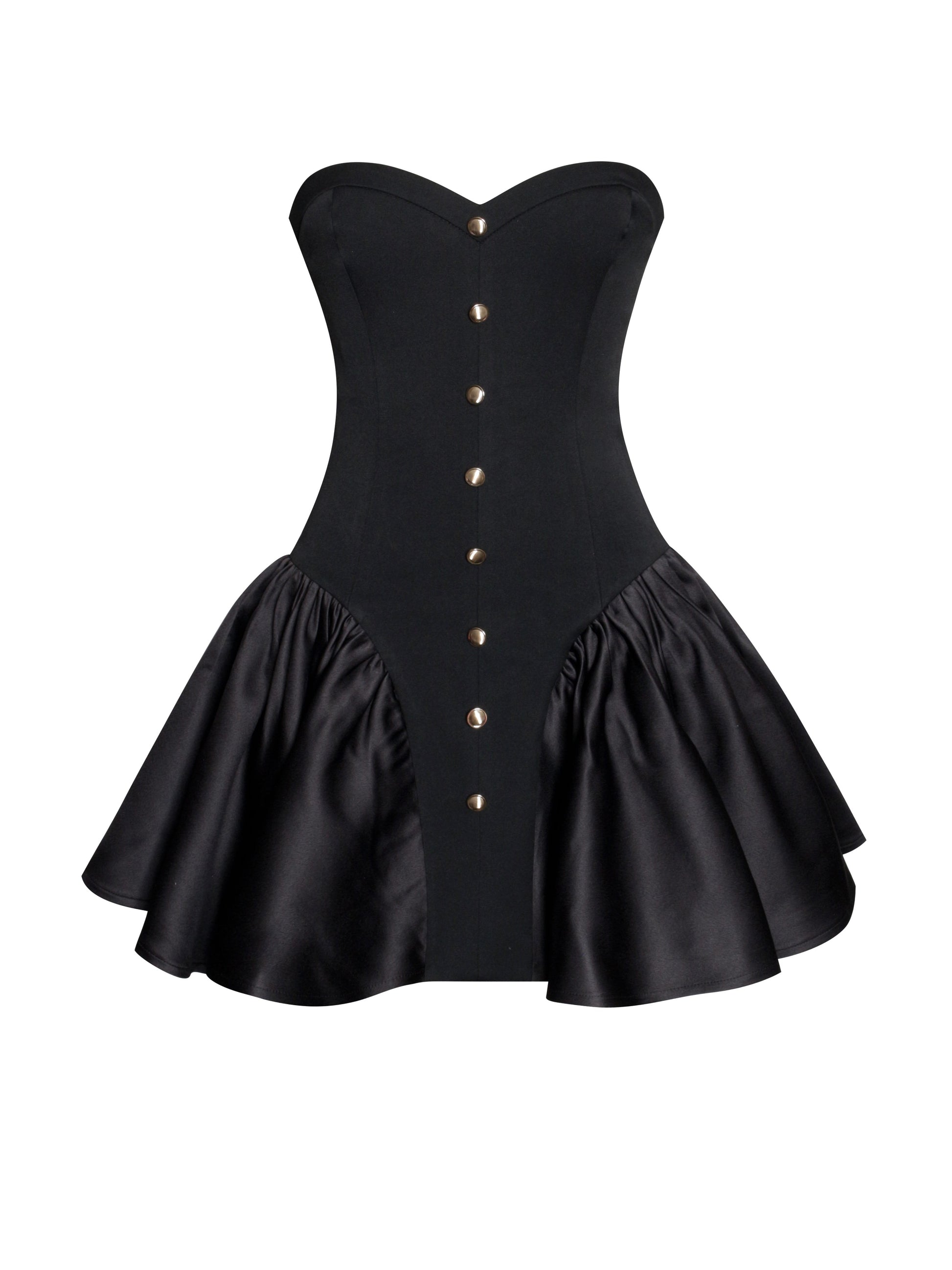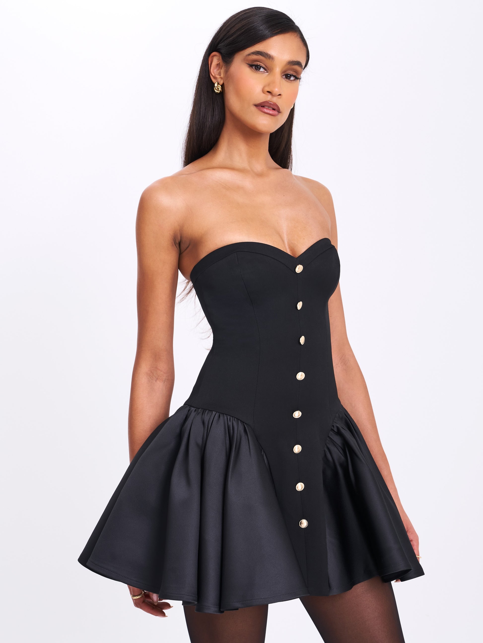 The Kaden Dress radiates timeless elegance with its sleek black design and refined details. Featuring a graceful sweetheart collar and a chic strapless silhouette, it's designed to make a statement. The drop waist enhances your figure, flowing into a voluminous skirt supported by inside skirt structure for added flair. Thoughtfully designed with non-slip straps for a secure fit, the dress is adorned with golden buttons that add a touch of luxury.